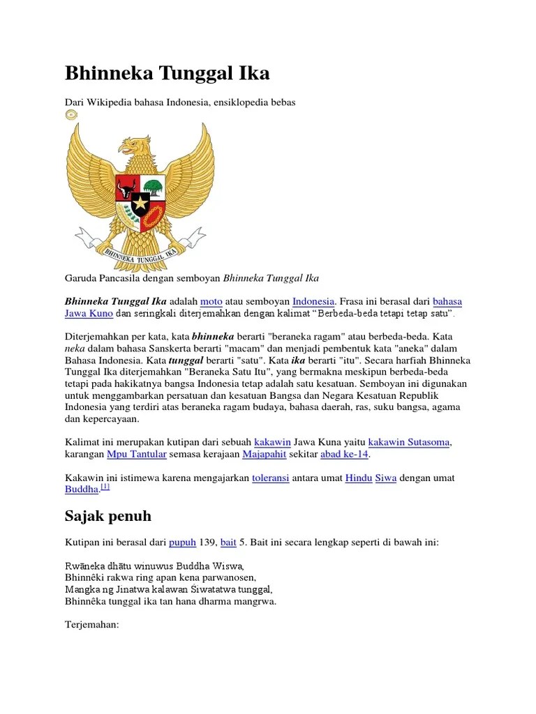 Jika terdapat pertikaian sebaiknya diselesaikan dengan mencari titik temu antara kedua belah pihak. Arti bhineka tunggal ika yang sebenarnya, tujuan bhineka tunggal ika, pada mulanya istilah kata fungsi bhinneka tunggal ika. Dalam pameran yang berlangsung sejak 2 hingga 15 juni 2017 ini, kakawin sutasoma bisa ditemukan tepat di tengah setelah gapura pintu masuk pameran. Kutipan frasa bhinneka tunggal ika sendiri terdapat dalam petikan pupuh 139 bait 5 pada kakawin sutasoma. … di dalam kitab sutasoma yang ditulis oleh mpu tantular tersebut, terdapat tulisan.